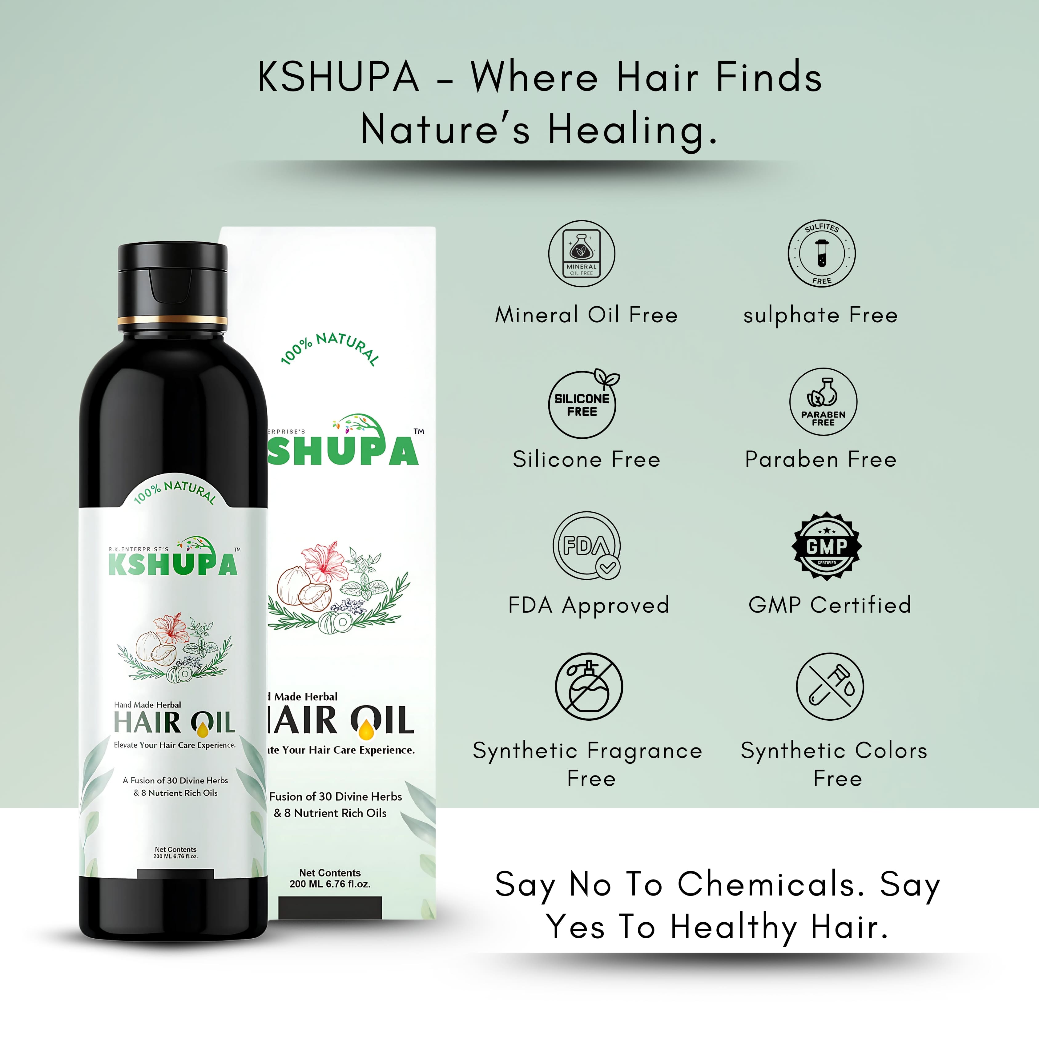 Traditional cold‑pressed fusion of nutrient-rich oils and potent herbs to reduce hair fall, strengthen roots and nourish the scalp naturally.Kshupa’s Handmade Herbal Hair Oil is crafted with 8 cold‑pressed oils including coconut, sesame, castor, olive, mustard, rosemary, neem, and flaxseed, infused with 36 therapeutic Ayurvedic herbs such as Bhringraj, Amla, Brahmi, Hibiscus, Nagarmotha, Fenugreek, and Curry Leaves. This luxurious oil repairs scalp, controls hair fall, restores shine & softness, prevents premature greying, and boosts hair volume. 100% natural and chemical-free.
