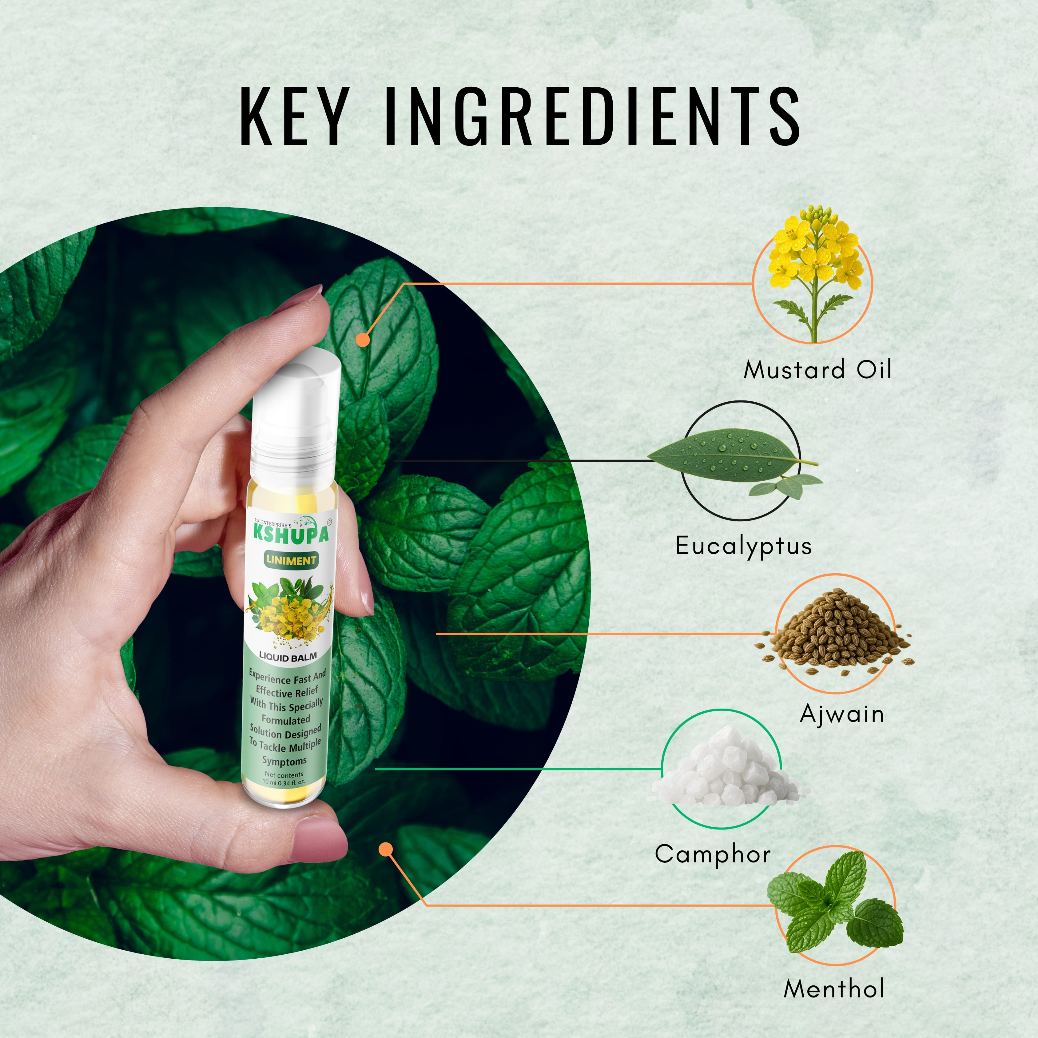 Kshupa Liquid Balm provides instant herbal relief from headache, cold, nasal congestion, and joint and muscle pain. Its lightweight, non-staining formulation with menthol, camphor, eucalyptus and mustard oil penetrates quickly to soothe discomfort, reduce fatigue, and freshen the senses. 100% natural and travel friendly. Fast-absorbing, non-greasy herbal balms infused with menthol, camphor & mustard oil for quick relief.