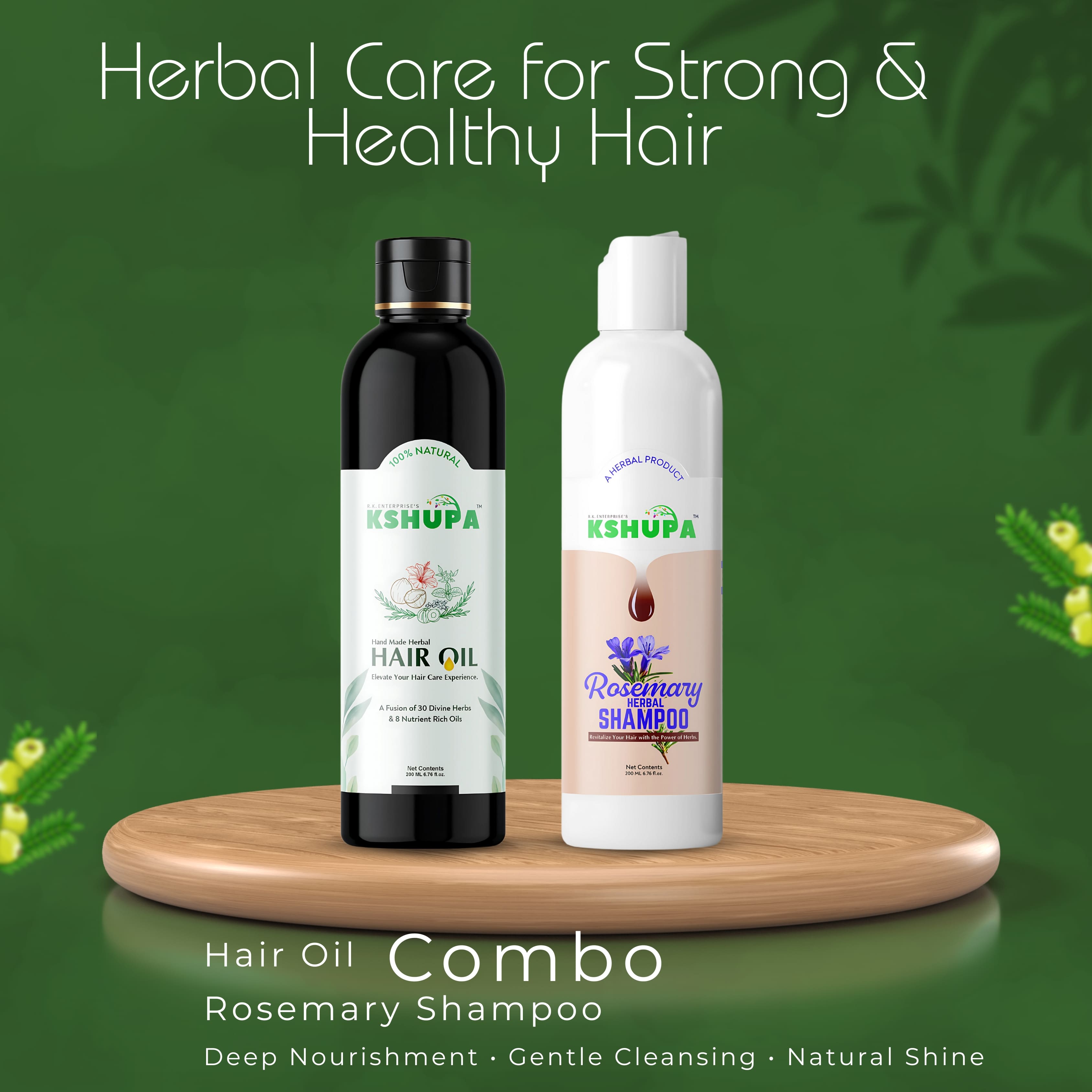 Nourish your hair naturally with the Kshupa Hair Care Combo, a perfect 2-in-1 Ayurvedic solution for hair fall, dandruff, and weak roots. This combo brings together the power of traditional handmade herbal hair oil with the refreshing and strengthening benefits of rosemary shampoo, offering complete scalp-to-tip care.