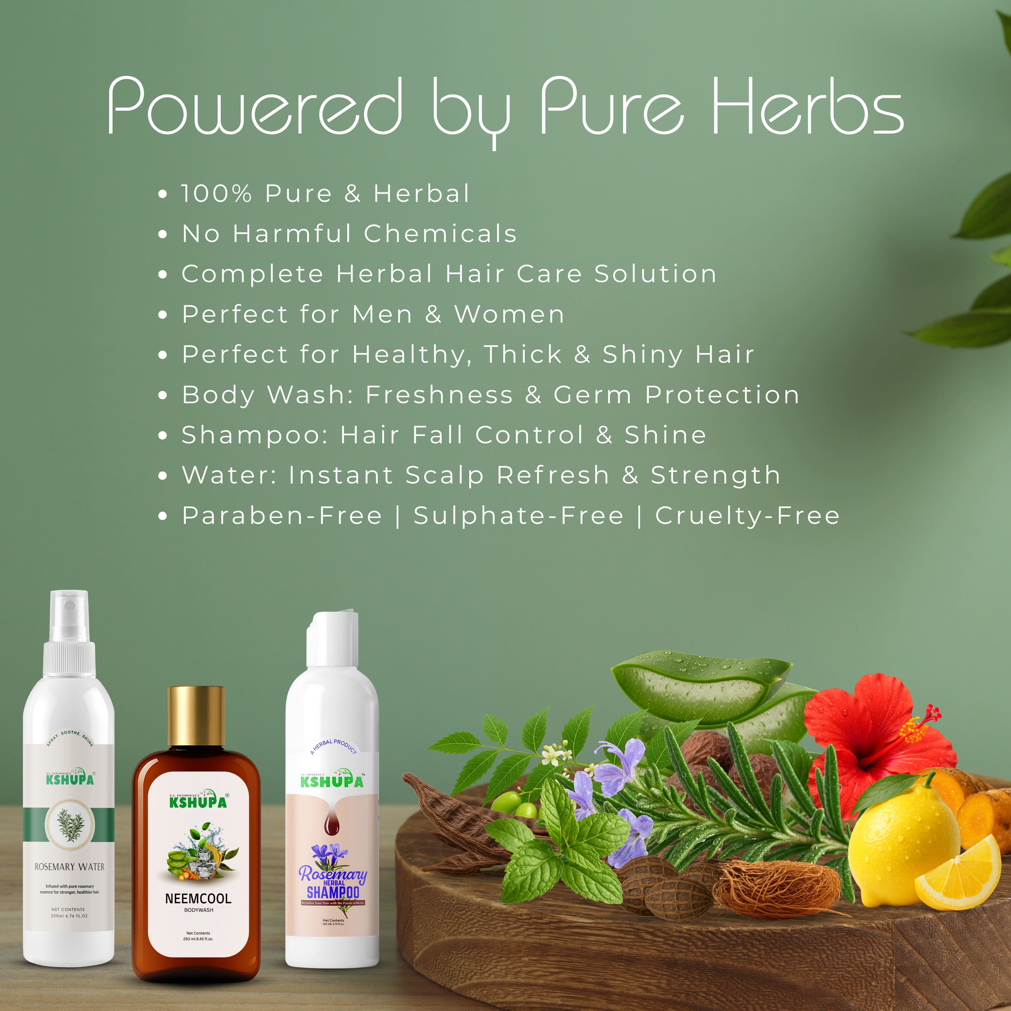 HERBAL HAIR & BODY CARE TRIO | Rosemary Water + Rosemary Shampoo + Neem Cool Body Wash | Complete Herbal Care Combo