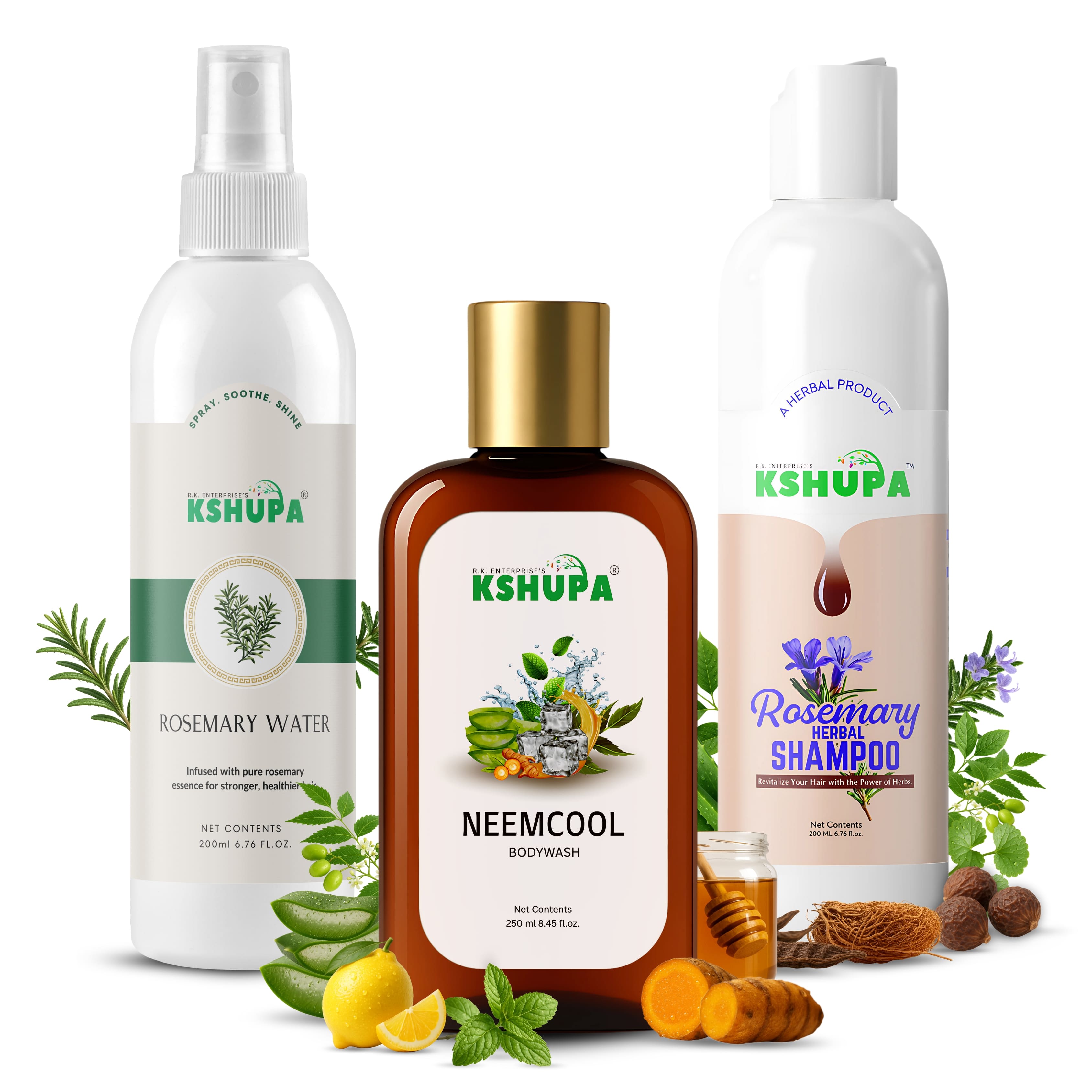 Give your hair and skin the ultimate herbal pampering with the Kshupa Hair & Body Care Trio Pack. This complete wellness. combo includes: Rosemary Water (200 ml)100% pure, steam-distilled rosemary water. Rosemary Shampoo (200 ml) Enriched with Rosemary, Bhringraj, Hibiscus, Aloe Vera & Shikakai. Neem Cool Body Wash (250 ml)Infused with Neem, Honey, Mint, Aloe Vera & Turmeric. This Trio Pack ensures complete head-to-toe natural care. Perfect for daily use and ideal for those seeking an herbal lifestyle upgrade.