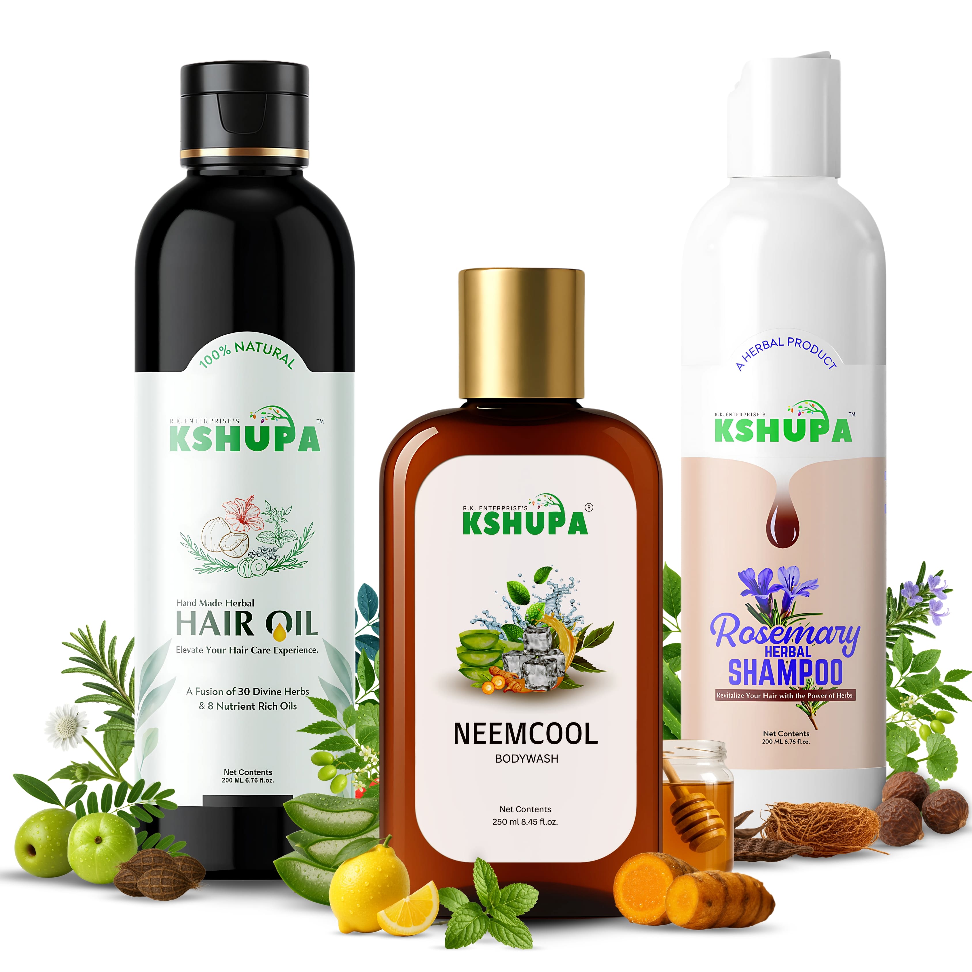 HERBAL TRIO PACK | Handmade Herbal Hair Oil (200ml) + Rosemary Shampoo (200ml) + Neem Cool Body Wash (250ml) | Complete Hair & Body Care Combo