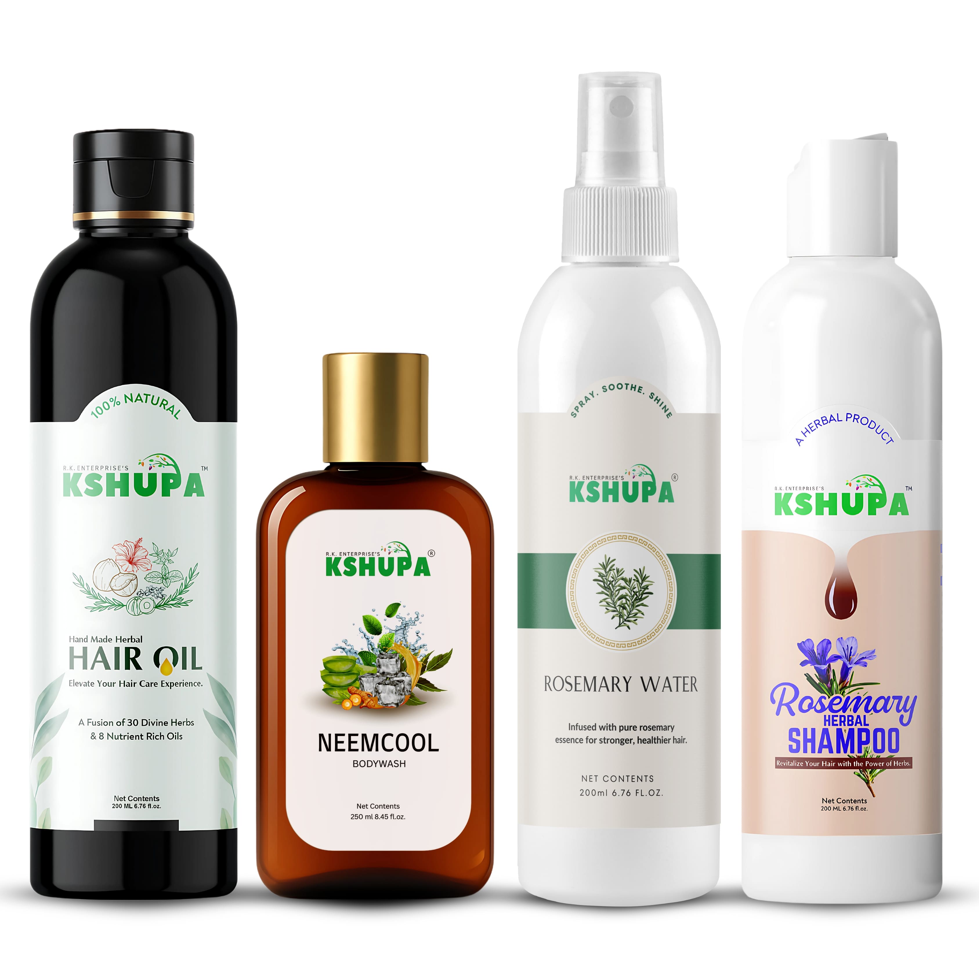 HERBAL QUAD COMBO | Rosemary Water (200ml) + Rosemary Shampoo (200ml) + Neem Cool Body Wash (250ml) + Handmade Herbal Hair Oil (200ml) | Complete Ayurvedic Hair & Body Care