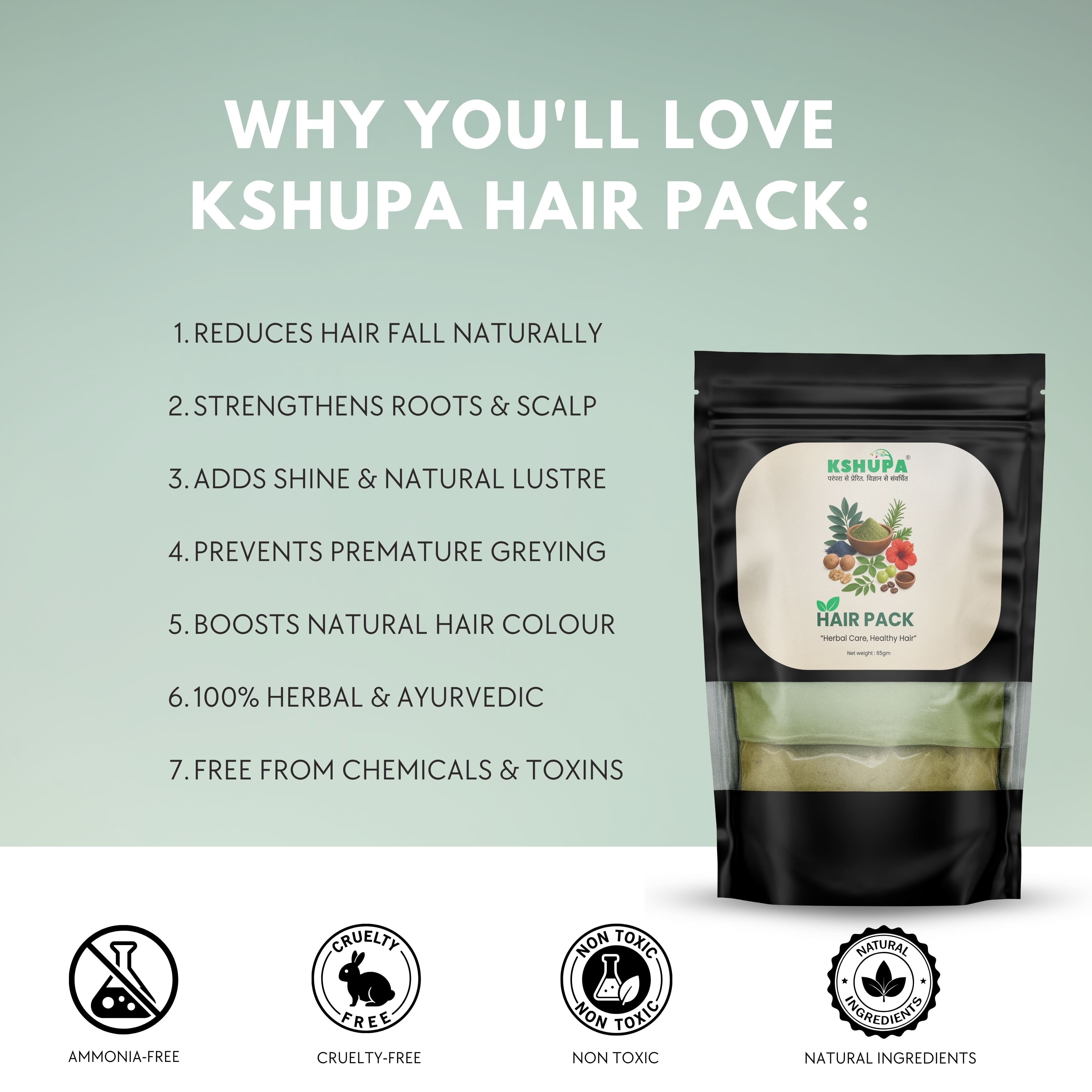Beyond Colour: A Hair Treatment That Strengthens, Revives, and Naturally Colours! Kshupa’s Natural Ayurvedic Hair Pack is a powerful solution for those seeking to revive dull, damaged hair while naturally managing premature greying. This potent, Ammonia-Free, Non-Toxic blend features a host of Ayurvedic superstars: Indigo, Henna, Amla, Bhringraj, and Rosemary. The unique two-step application process ensures deep nourishment, strengthening hair roots, minimizing hair fall, and providing a natural, chemical-free solution to maintain your hair's youthful colour. Restore unparalleled shine, resilience, and softness without exposure to harsh chemicals.