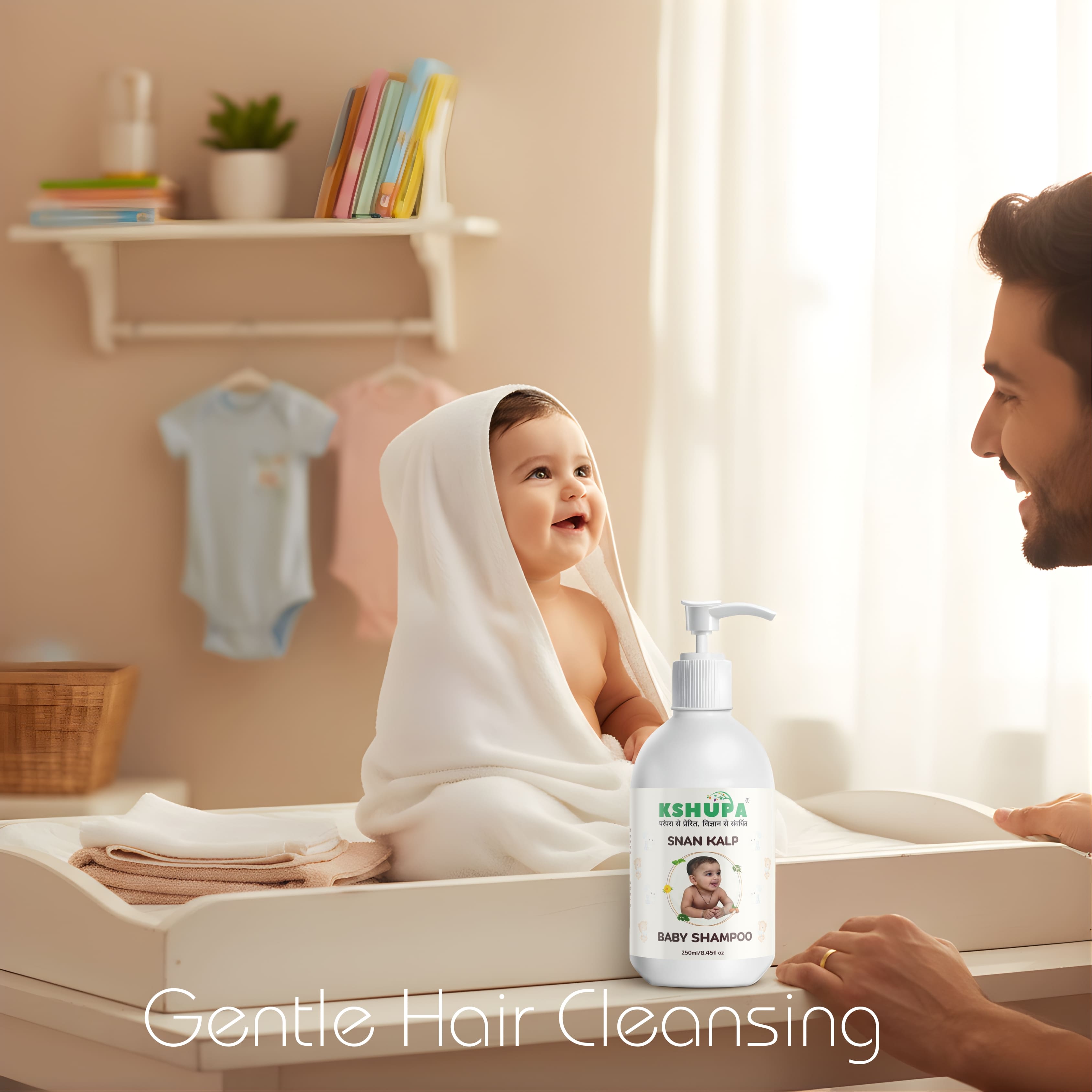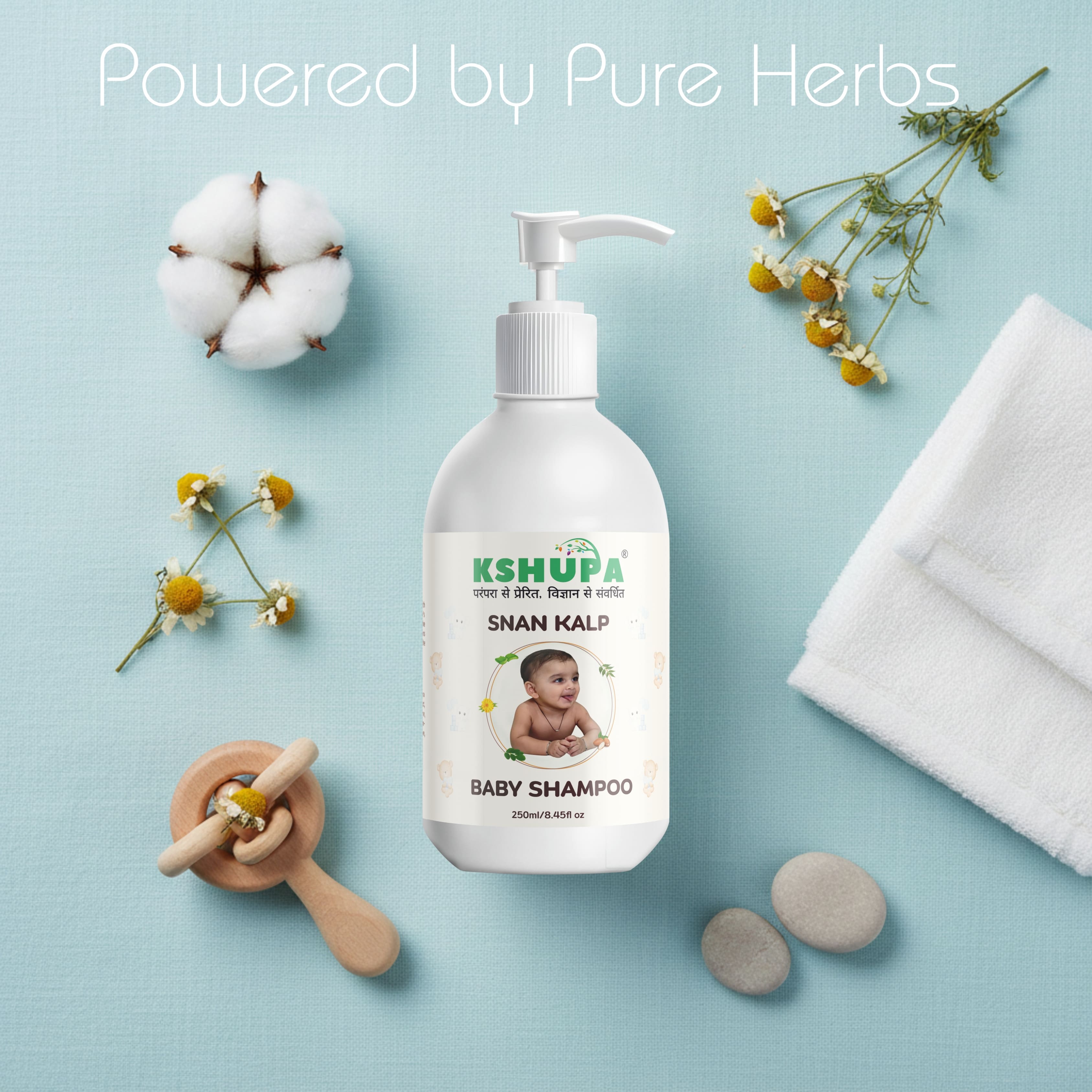 Cleanse: During the bath, use Snan Kalp Herbal Baby Shampoo on the scalp and hair. Lather gently and rinse thoroughly with water.