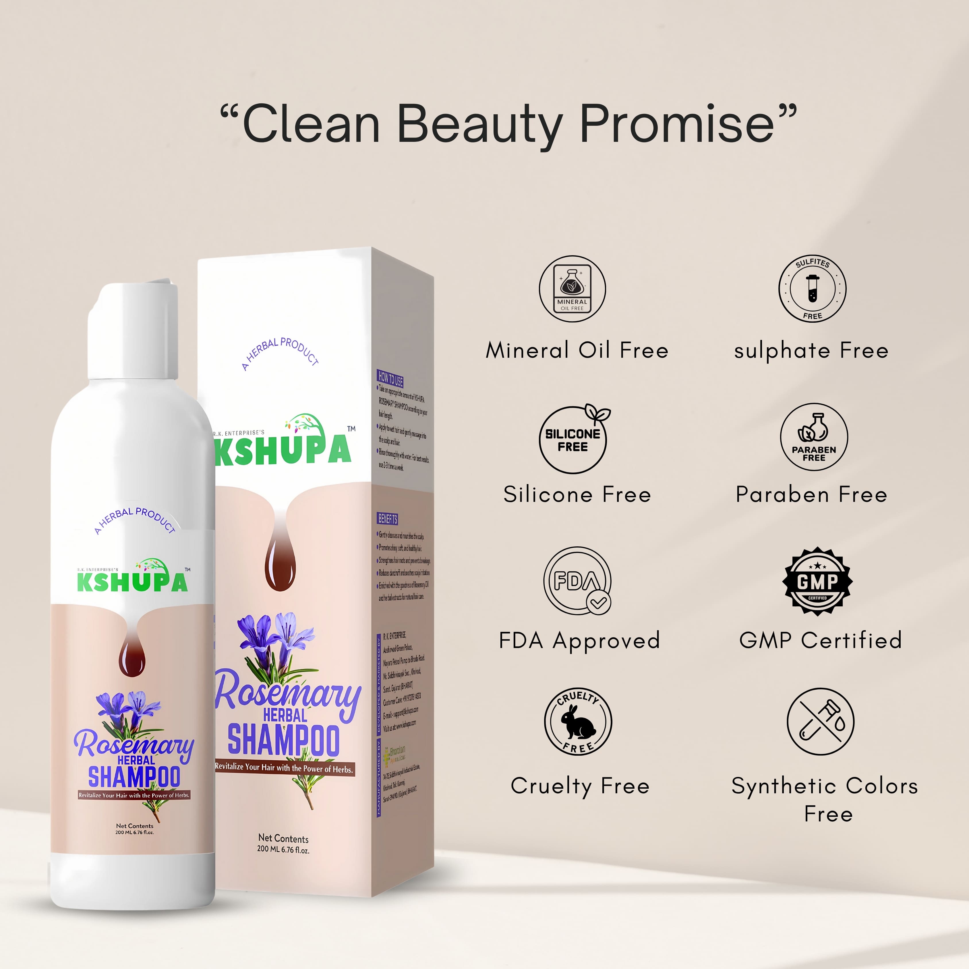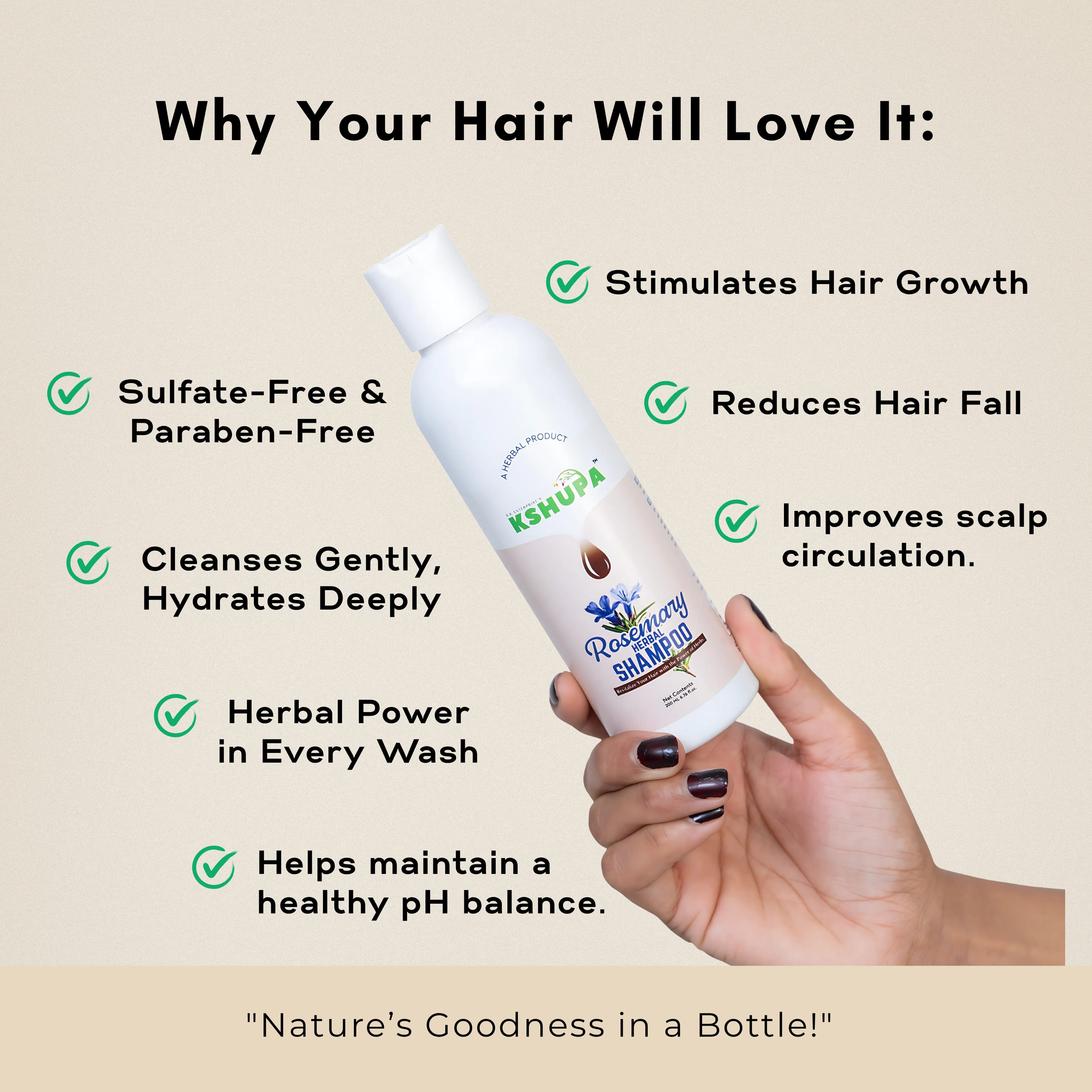 Embrace nature’s purity with Kshupa Rosemary Herbal Shampoo – your daily solution for stronger, healthier hair. FDA Approved. Cruelty-Free.