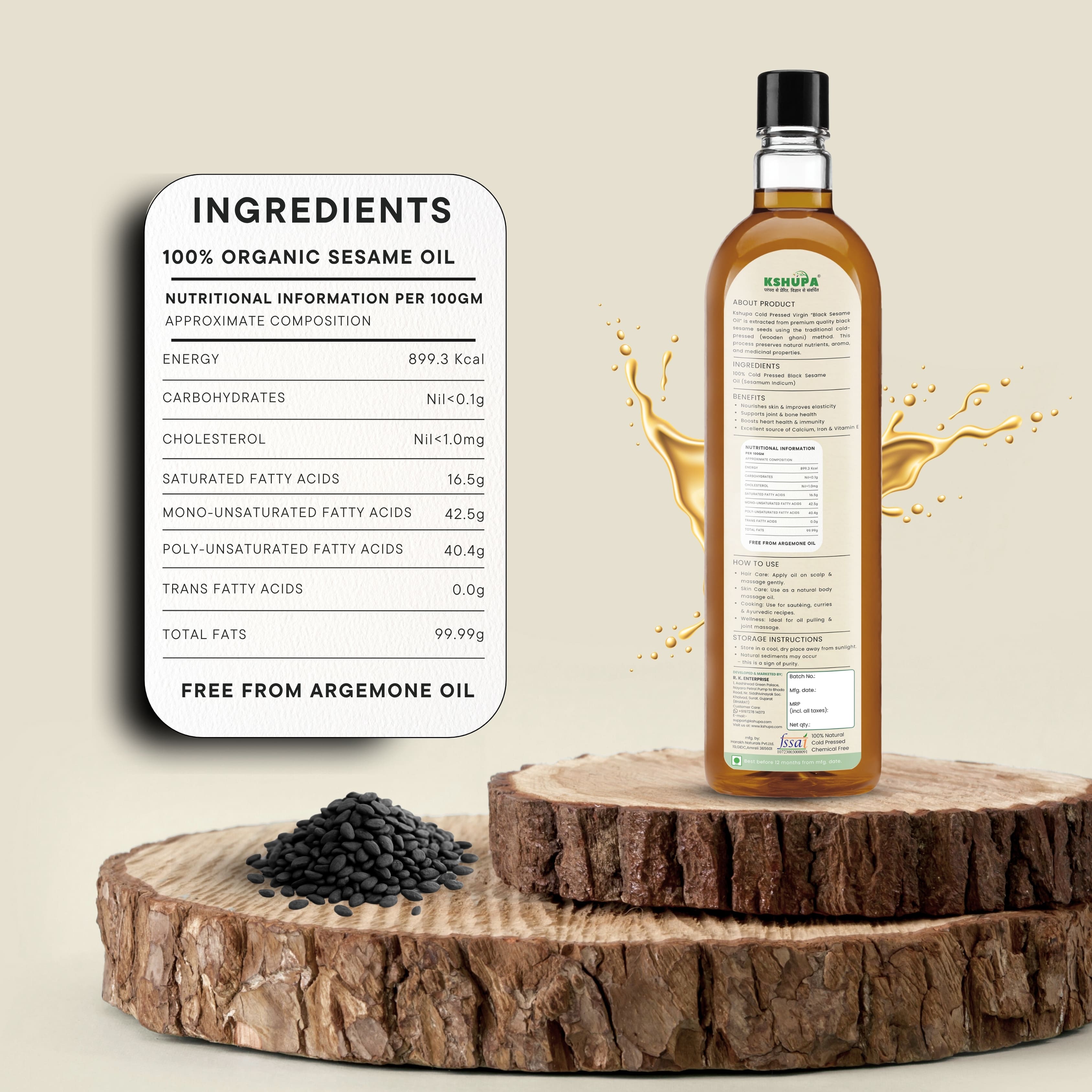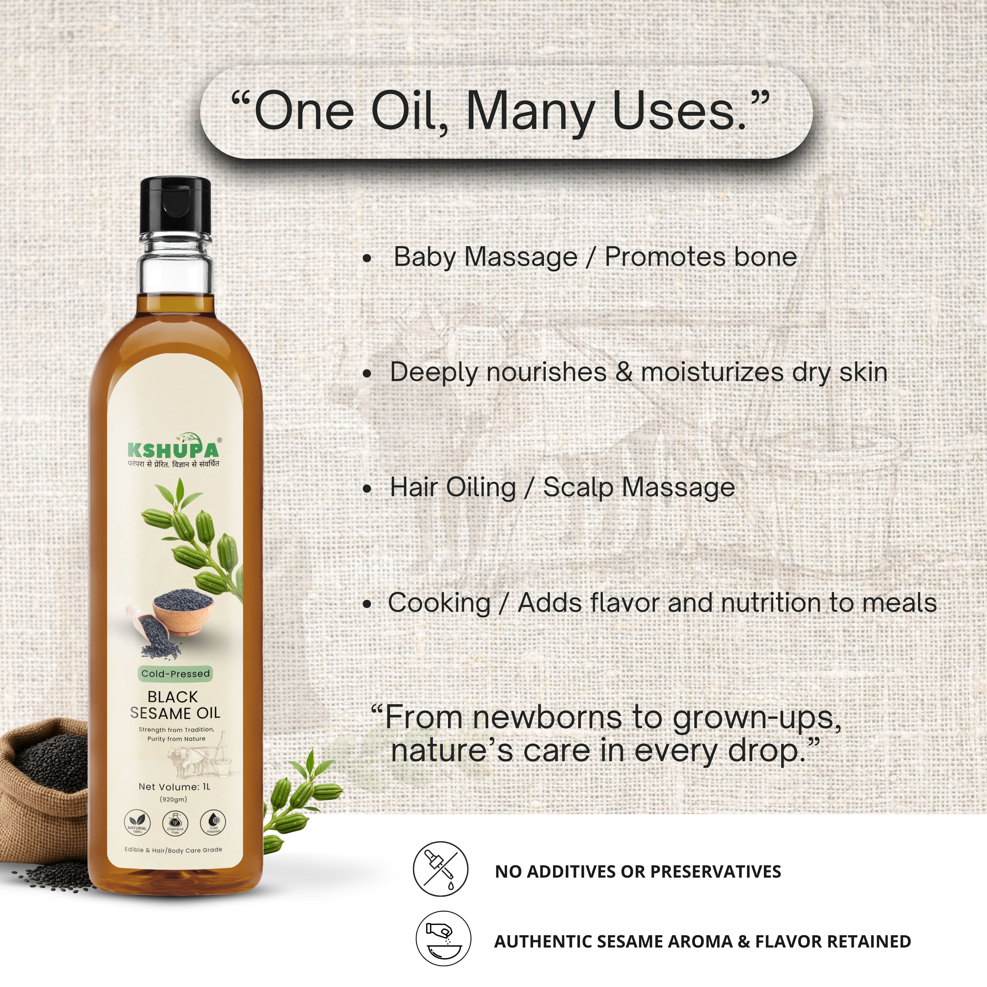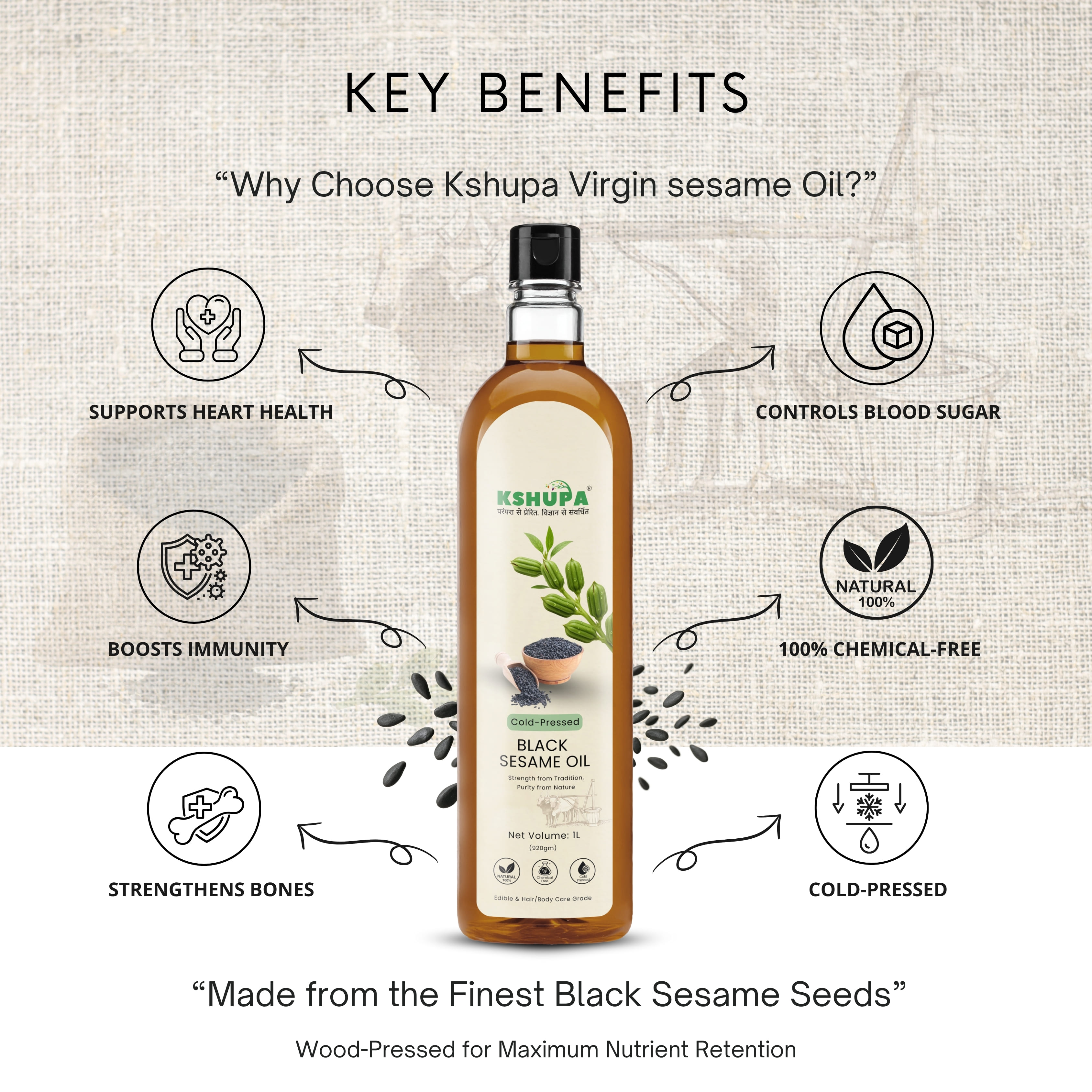 Pure, nutritious, and multi-purpose, Kshupa Extra Virgin Black Sesame Seed Oil is a must-have for a healthier lifestyle!