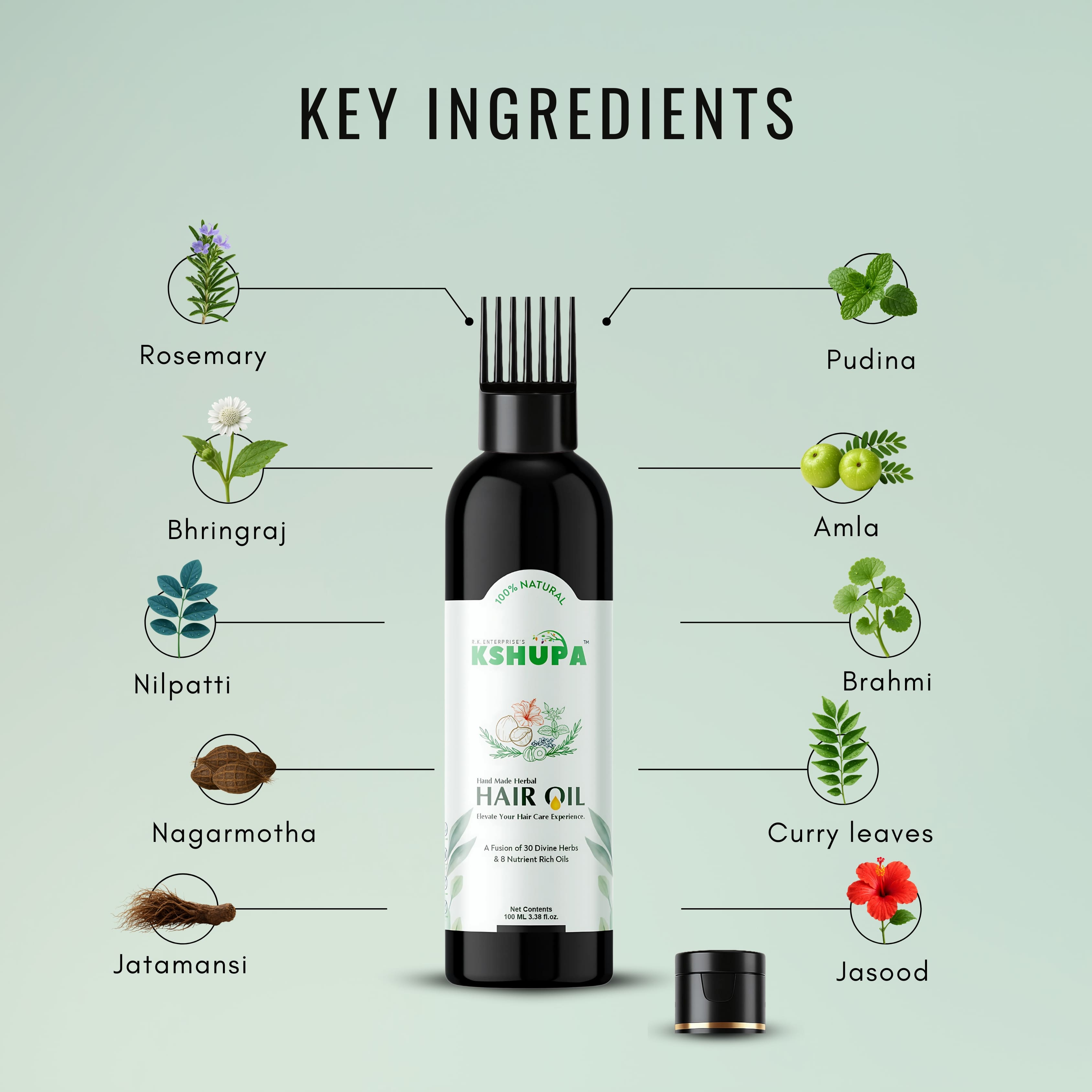 Traditional cold‑pressed fusion of nutrient-rich oils and potent herbs to reduce hair fall, strengthen roots and nourish the scalp naturally.Kshupa’s Handmade Herbal Hair Oil is crafted with 8 cold‑pressed oils including coconut, sesame, castor, olive, mustard, rosemary, neem, and flaxseed, infused with 36 therapeutic Ayurvedic herbs such as Bhringraj, Amla, Brahmi, Hibiscus, Nagarmotha, Fenugreek, and Curry Leaves. This luxurious oil repairs scalp, controls hair fall, restores shine & softness, prevents premature greying, and boosts hair volume. 100% natural and chemical-free.