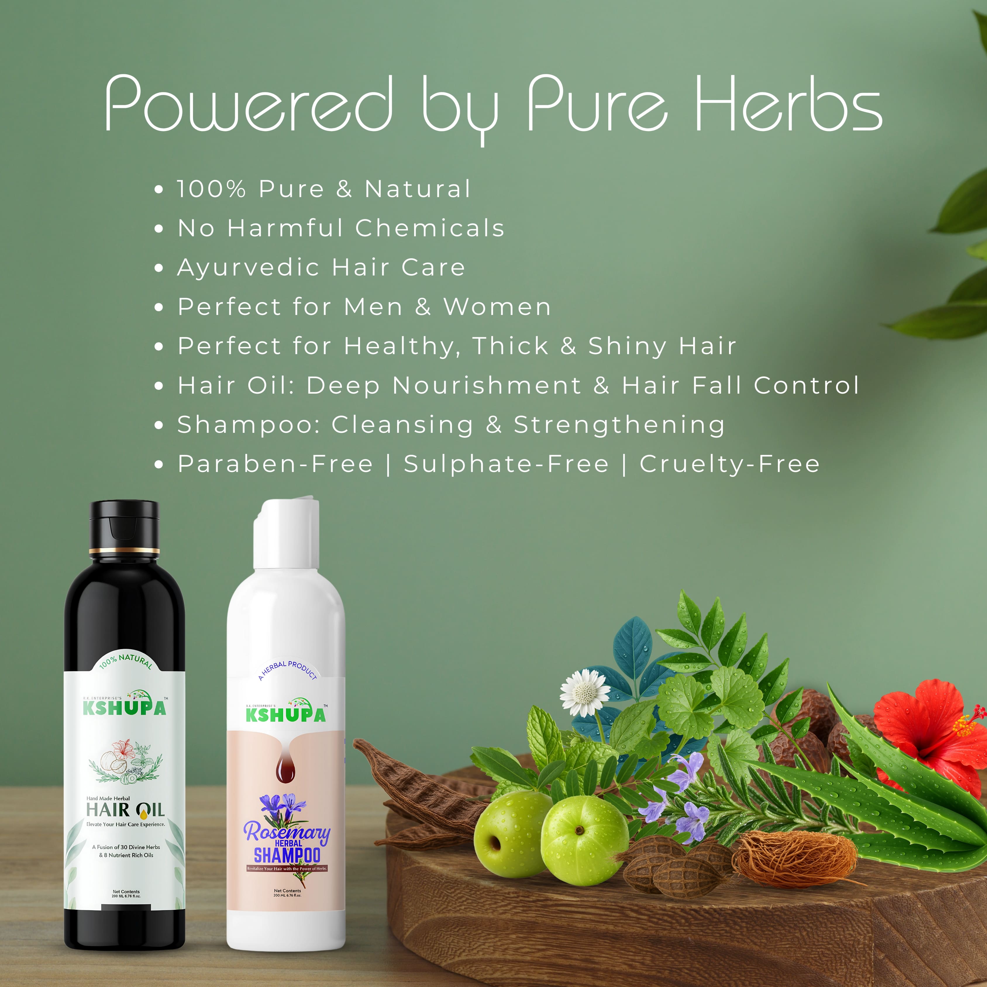 Nourish your hair naturally with the Kshupa Hair Care Combo, a perfect 2-in-1 Ayurvedic solution for hair fall, dandruff, and weak roots. This combo brings together the power of traditional handmade herbal hair oil with the refreshing and strengthening benefits of rosemary shampoo, offering complete scalp-to-tip care.