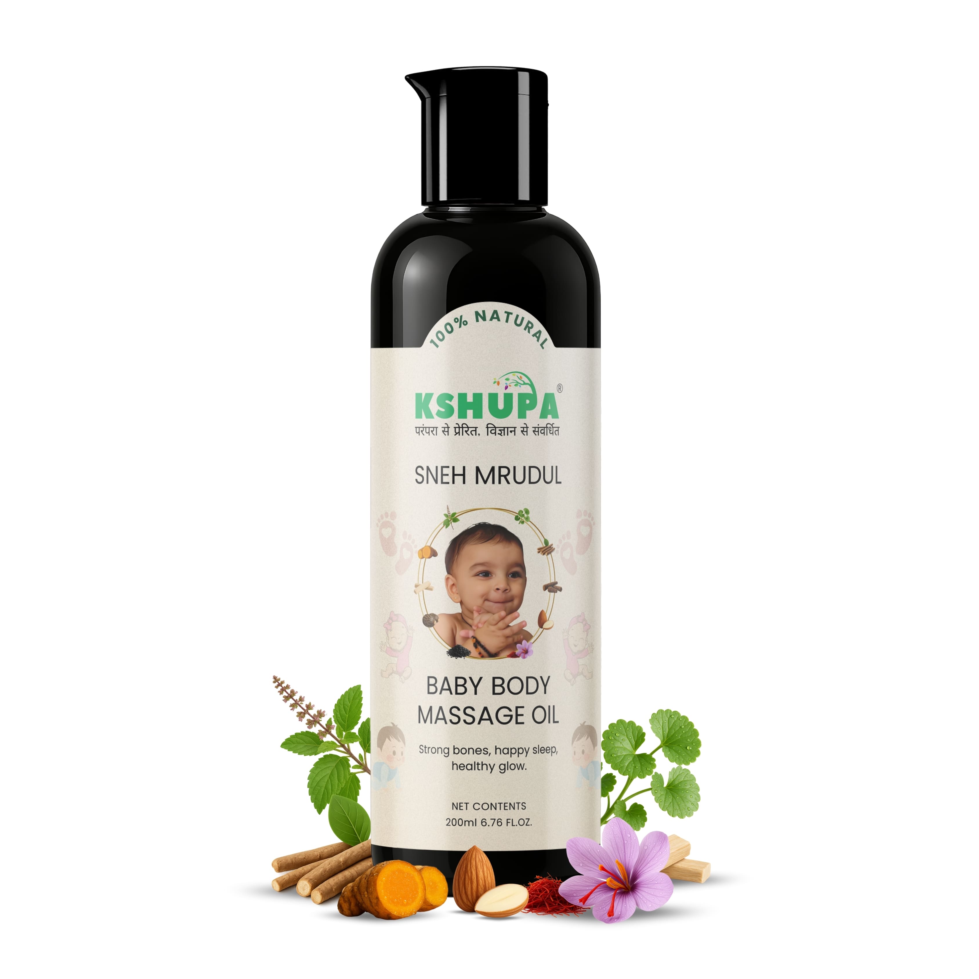 The Gift of Traditional Touch: Nurture Your Baby with Ayurvedic Purity! Kshupa’s "Sneh Mrudul" Baby Massage Oil is an Ayurvedic Proprietary Medicine crafted with the most delicate care. This potent blend features nourishing cold-pressed oils and powerful herbal extracts like Ashwagandha, Brahmi, Tulsi, and Lavender. Regular massage with this oil helps strengthen the baby's bones and muscles, improves blood circulation, and promotes the deep, restorative sleep essential for growth. The oil is exceptionally lightweight, non-sticky, and fast-absorbing, ensuring the baby remains comfortable after the massage. Give your little one the love of traditional, chemical-free care for healthy development and peaceful nights.