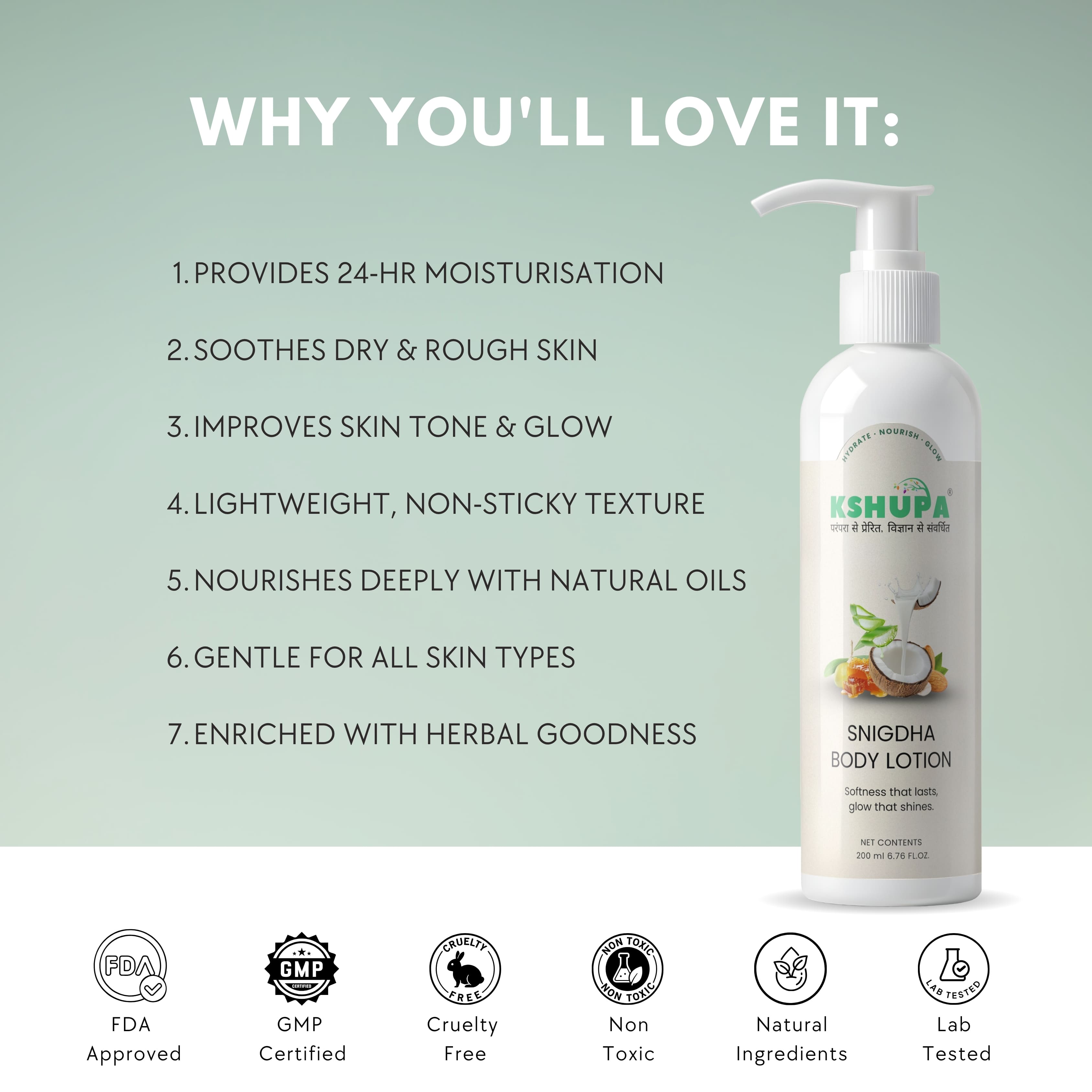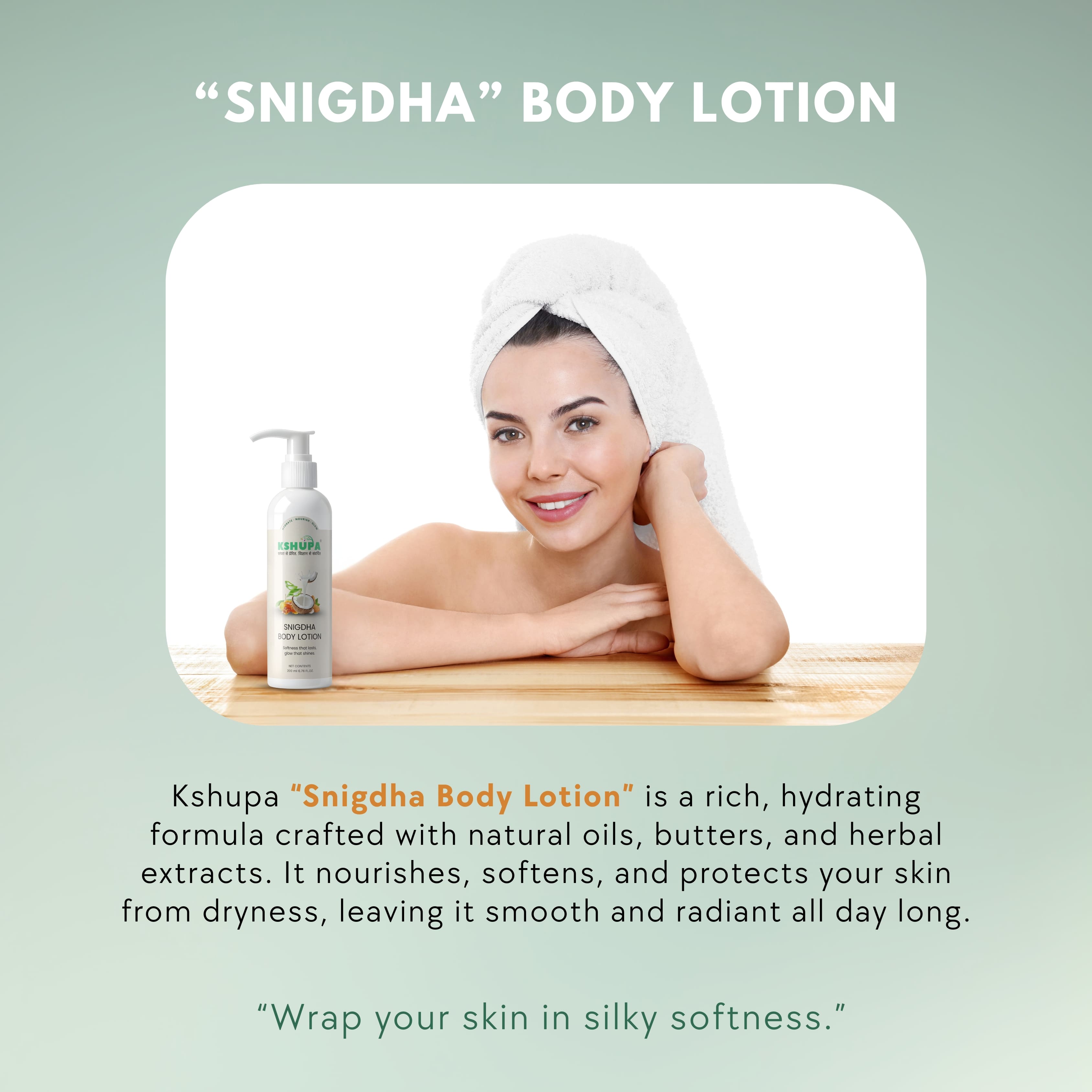 The Secret to All-Day Softness: Deep Nourishment Without the Greasy Feel! Kshupa's "Snigdha Body Lotion" is your go-to solution for conquering dry, dull skin. This rich, creamy formula is powered by nature's finest hydrators, including luxurious Shea Butter for deep conditioning, soothing Aloe Vera Extract, and skin-repairing Vitamin E and Wheatgerm Oil. Designed for rapid absorption, this lotion leaves your skin feeling smooth, supple, and radiantly healthy all day long, yet remains perfectly non-greasy. The inclusion of Beeswax and natural oils forms a protective barrier, locking in moisture to prevent dryness and boosting your skin's natural glow. Achieve the soft, luminous skin you crave with this paraben-free daily essential.