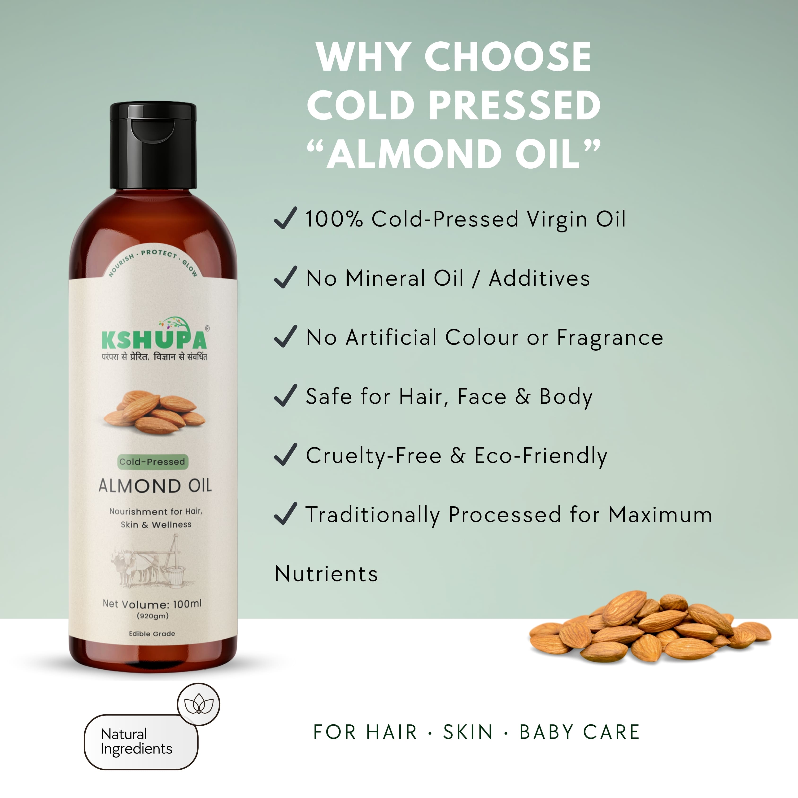 Liquid Gold for Skin and Hair: Experience the Unprocessed Power of Almonds! Kshupa’s Cold-Pressed Virgin Almond Oil is meticulously extracted from premium sweet almonds without any heat or chemicals, preserving its rich content of Vitamin E, Omega fatty acids, and powerful antioxidants. This versatile, Edible Grade oil is a must-have for targeted beauty concerns. It works wonders to naturally lighten dark circles, improve skin texture, and provide intense anti-aging hydration. For hair, it reduces breakage and imparts exceptional shine. Use this 100% pure, unadulterated oil daily for nourishment that goes beyond the surface.