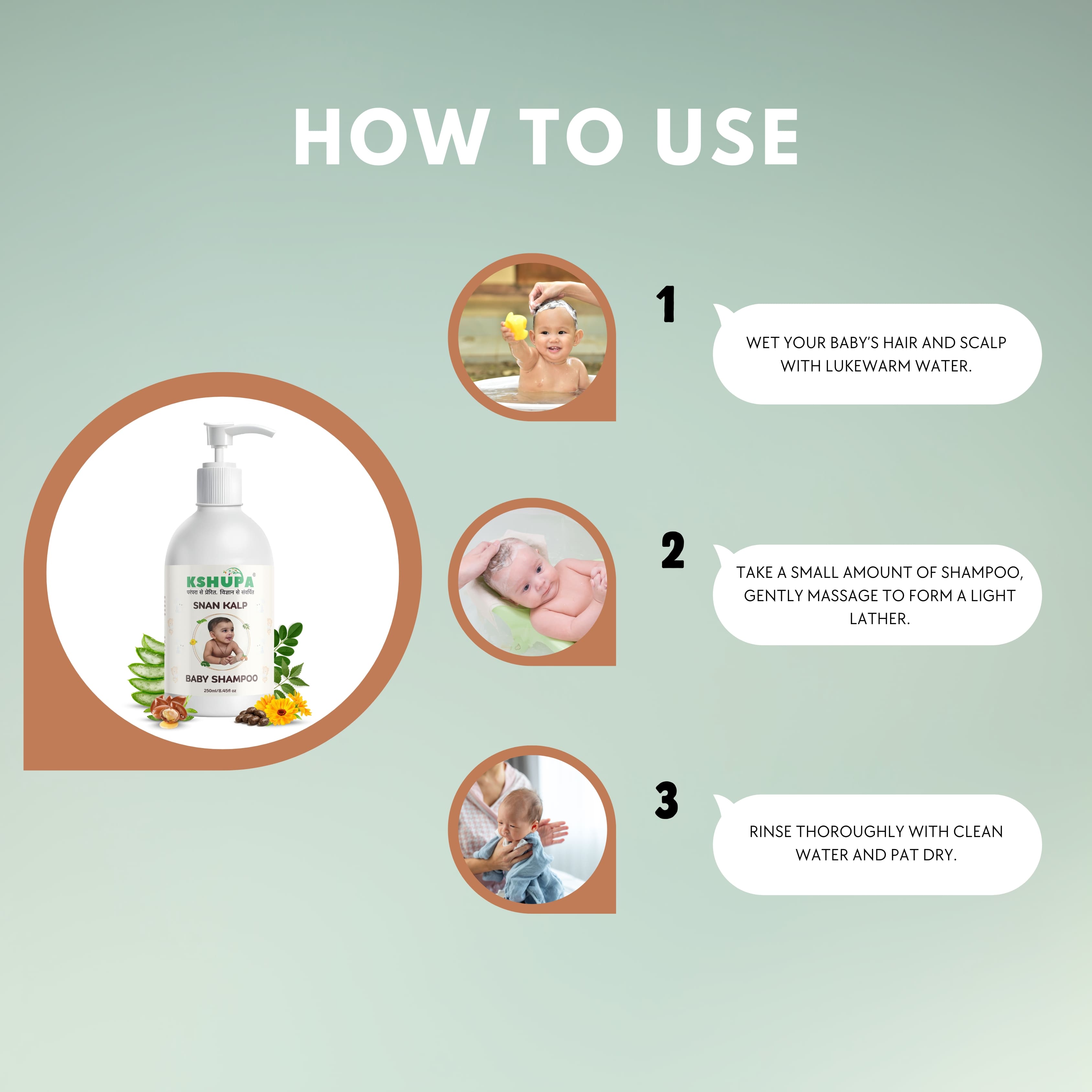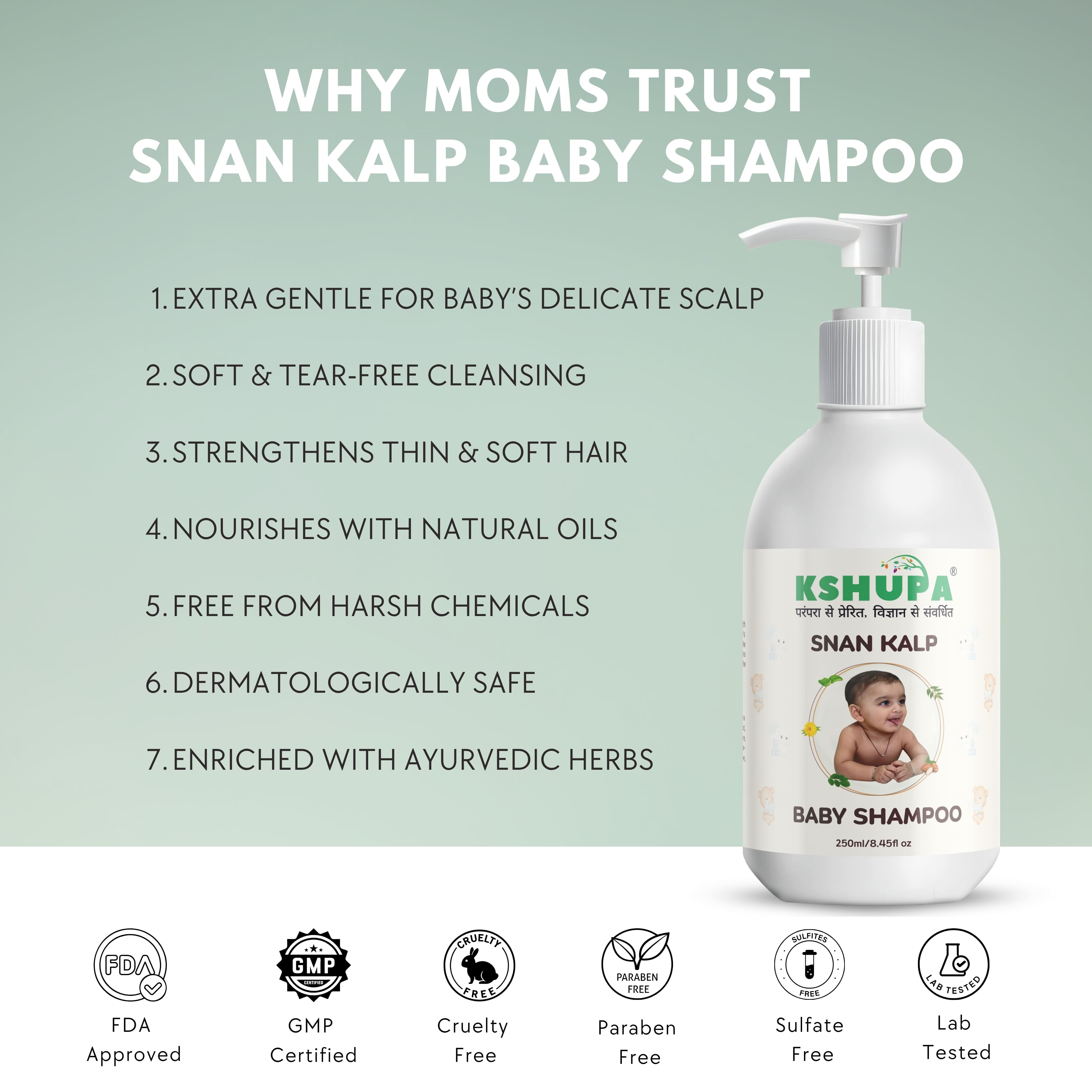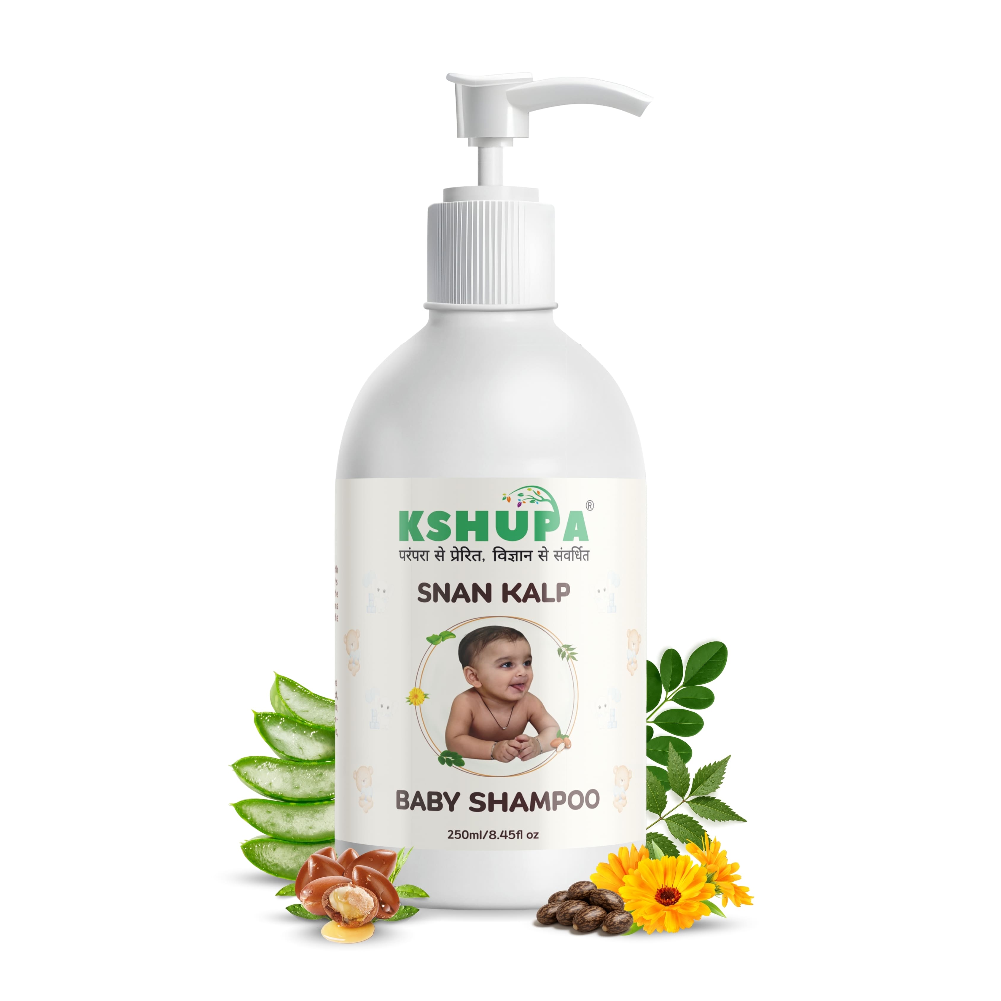 Mom-Approved Care, Nature's Love for Tiny Tresses! Kshupa's Snan Kalp Baby Shampoo is crafted to give your baby the purest start to hair care, right from their very first bath. Rooted in the principles of Ayurveda, this shampoo is a gentle blend of nature, designed to provide the benefits of tradition with modern safety. Understanding the sensitivity of a baby's scalp and eyes, we have created a no-tear formula that turns bath time into a joyful, splashy experience, free from tears and irritation.
